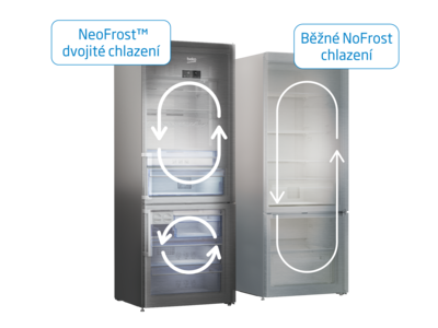 NeoFrost™ jsou dva chladící okruhy. Jeden v mrazáku drží suchý studený vzduch, druhý v chladničce zase ideální vlhkost. Nemíchá se tak vzduch mezi lednicí a mrazákem, tím pádem potraviny v lednici neosychají, nemíchají se pachy a vydrží déle čerstvé. Navíc mrazák není třeba odmrazovat a v lednici se na zadní stěně netvoří nepříjemné kapky.