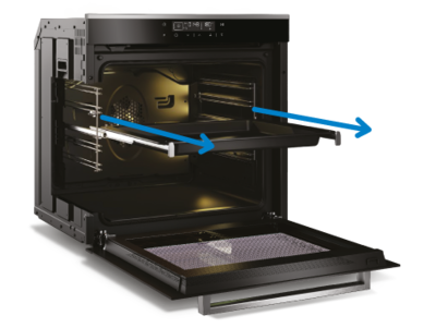 Teleskopický výsuv pomáhá vysunout plech s pečeným jídlem, aniž by bylo zapotřebí síly. Je vhodný pro bezpečnější vyjmutí rozpáleného plechu.
