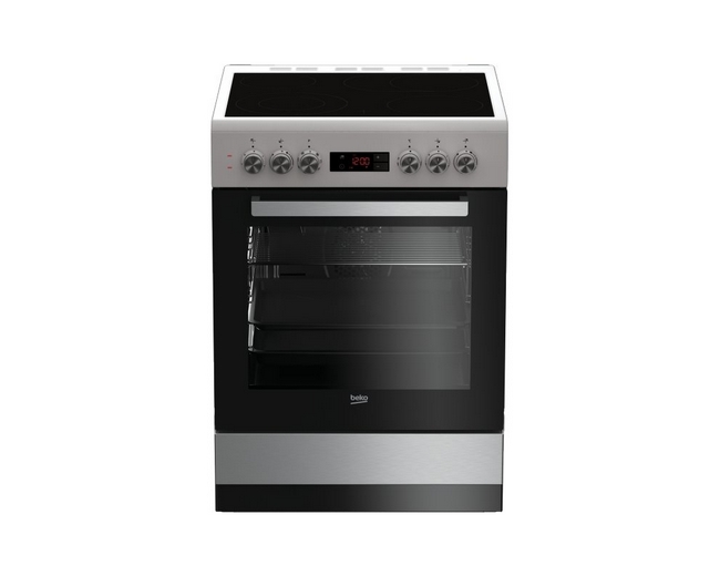 Nerezový sklokeramický sporák Beko FSM 67320 GXS šířky 60 cms multifunkční troubou o objemu 72 litrů. Sporák disponuje 8 funkcemi pečení, digitálním časovačem a trojitým sklem dvířek.