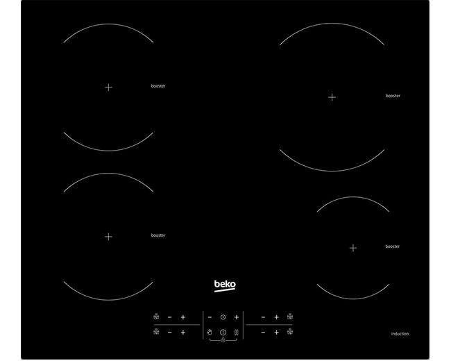 Indukční varná deska Beko se 4 varnými zónami, senzorovým ovládáním a dětským zámkem.