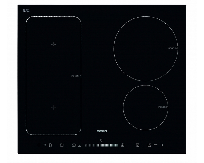 Indukční varná deska Beko HII 64500 FT s dotykovým ovládáním. Tato deska vám nabídne 2 klasické kruhové varné zóny a 2 zóny, které můžete používat každou zvlášť, nebo dohromady. Nastavení teploty vaření je velice jednoduché díky posuvnému slideru, na kterém můžete nastavit až 19 úrovní vaření
