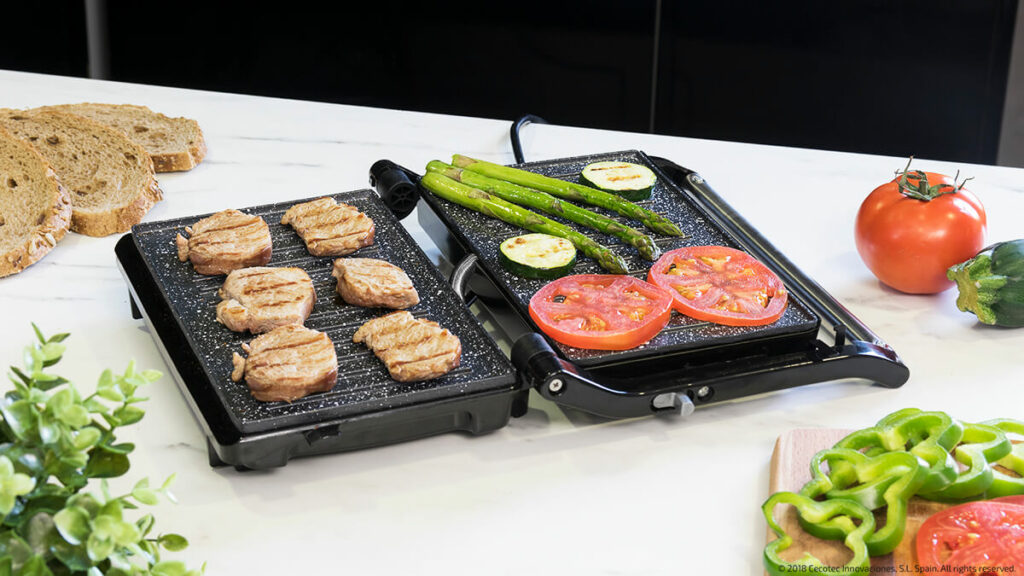 Vařte bez omezení. S varnou plochou 23 cm x 14,5 cm na každém talíři můžete připravovat maso, hamburgery, špízy, zeleninu, sendviče a všechno, co si dokážete představit.