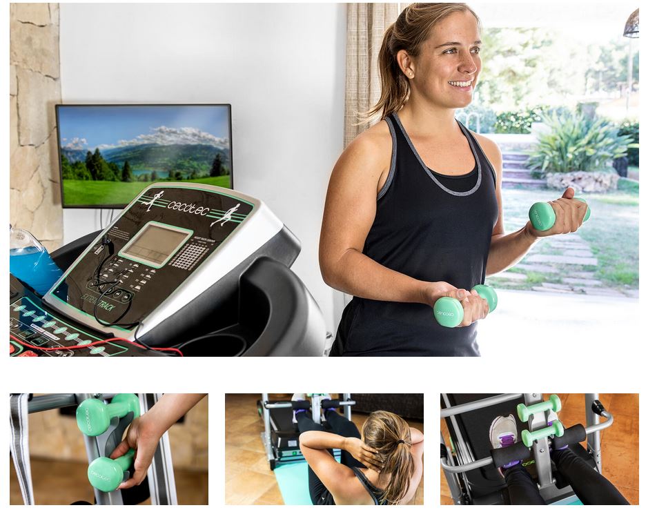 Cecotec RunFit Sprint Vibrator má řadu prvků, které promění běžecký pás na skutečný multifunkční tréninkový stroj, zahrnuje činky a tyče pokryté pěnou pro různé typy cvičení, jako jsou sed-lehy atd.