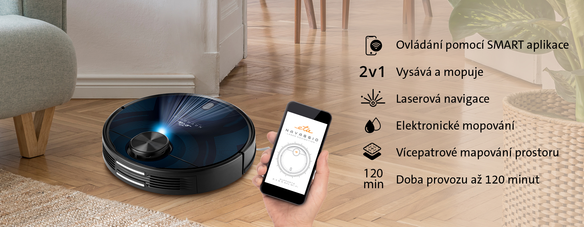 Výkonný a inteligentní robotický vysavač ETA Navaggio 2 v 1 se o úklid domácnosti postará za vás. ETA Navaggio podlahu nejen vysaje, ale zároveň i vytře. Oblasti úklidu můžete vysavači pohodlně určit v aplikaci ETA Navaggio, ve které naleznete spoustu dalších funkcí a možností vysavače.