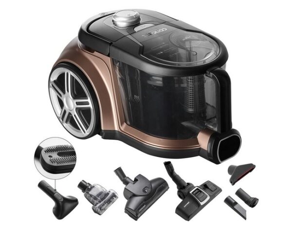 Nečistoty se zachytí v průhledné odpadní nádobě o objemu 2,2 l, kterou po naplnění jednoduše vysypete. Na nutnost vyprázdnění budete upozorněni světelnou signalizací. O kvalitní čistý vzduch při vysávání se postará HEPA filtr 13, který spolehlivě zachytí i ty nejmenší částice prachu. Plynulou elektronickou regulací sací síly si úklid vždy přizpůsobíte aktuálním potřebám. Velký akční rádius 10 m umožní pohodlný úklid velkých místností, měkčená kolečka jsou šetrná i k choulostivým povrchům a přední kolečko otočné o 360° zajistí plynulý a všestranný pohyb. Vysavač lze umístit do horizontální i vertikální parkovací polohy.