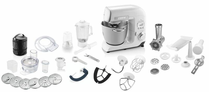 Součástí robota je bohaté příslušenství. Pro zpracování surovin využijete hnětací hák a hák pro bezlepkové těsto, šlehací, mísící a flexi metlu, která je vhodná pro krémy nebo lehká těsta. Nástavec na strouhání má 6 diskových struhadel a mlýnek na maso nabízí 4 hrubosti mletí. Pro přípravu klobás využijete nástavec na výrobu uzenin, s nástavcem na výrobu Kebbe vytvoříte masové kuličky a s tvořítkem na cukroví upečete dokonalé kousky, jeden jako druhý. Sekáček potravin rovnoměrně rozdrtí a rozmixuje všechny suroviny díky speciálně tvarovanému čtyřramennému noži, plastová nádoba má objem 420 ml a je opatřena silikonovým těsněním. Skleněný mixér o objemu 1,4 l nepohlcuje pachy ani barvy mixovaných potravin, ve výbavě je také plastové pěchovadlo. K robotu si můžete dokoupit další příslušenství, jako je kráječ na nudle, nástavec na válení těsta, citrusovač, lis na ovoce, mlýnek na mák, zmrzlinovač a další.