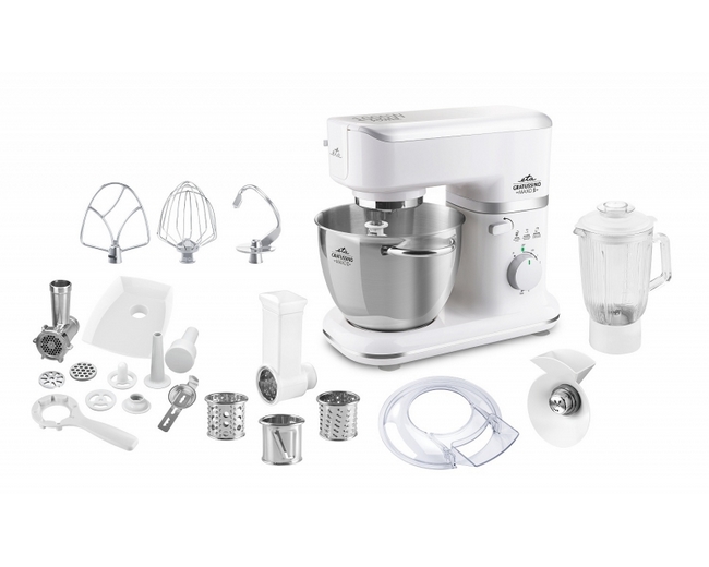 Multifunkční kuchyňský robot se širokou škálou příslušenství se stane nepostradatelným pomocníkem ve vaší domácnosti. Vysoké nároky na výkon plní svým 1000W motorem. Motor se stabilizátorem otáček přizpůsobí svou rychlost tuhosti připravovaného těsta a udržuje nastavené otáčky i při velkém zatížení. Výkyvné rameno umožňuje jednoduchou výměnu nástavců a současně zabrání samovolnému spuštění robota. Umožňuje rychlé sestavení, jednoduché ovládání a snadnou údržbu. Svým moderním designem ozdobí každou kuchyň.