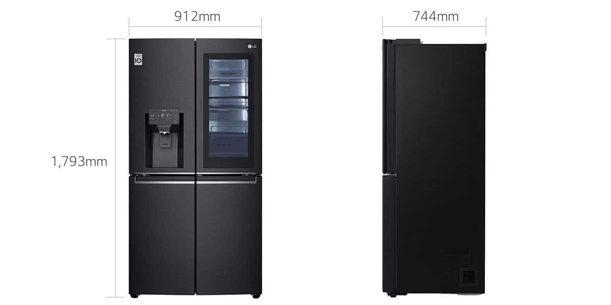 volně stojící americká chladnička s mrazničkou dole | výška 179,3 cm | objem chladicí části 365 l | objem mrazicí části 273 l | energetická třída F | mrazicí výkon 11 kg/den | akumulační doba 12 hod. | invertorový lineární kompresor LG | InstaView Door-in-Door™ | Door Cooling+™ | LG Total No Frost | Multi Air Flow | AI Smart Learner | Surround Cooling | Pure N Fresh | UVnano | LG ThinQ + Wi-Fi | Metal Fresh | alarm otevřených dveří | dětský zámek | max. hlučnost 40 dB | rozměry 912 × 1793 × 744 mm