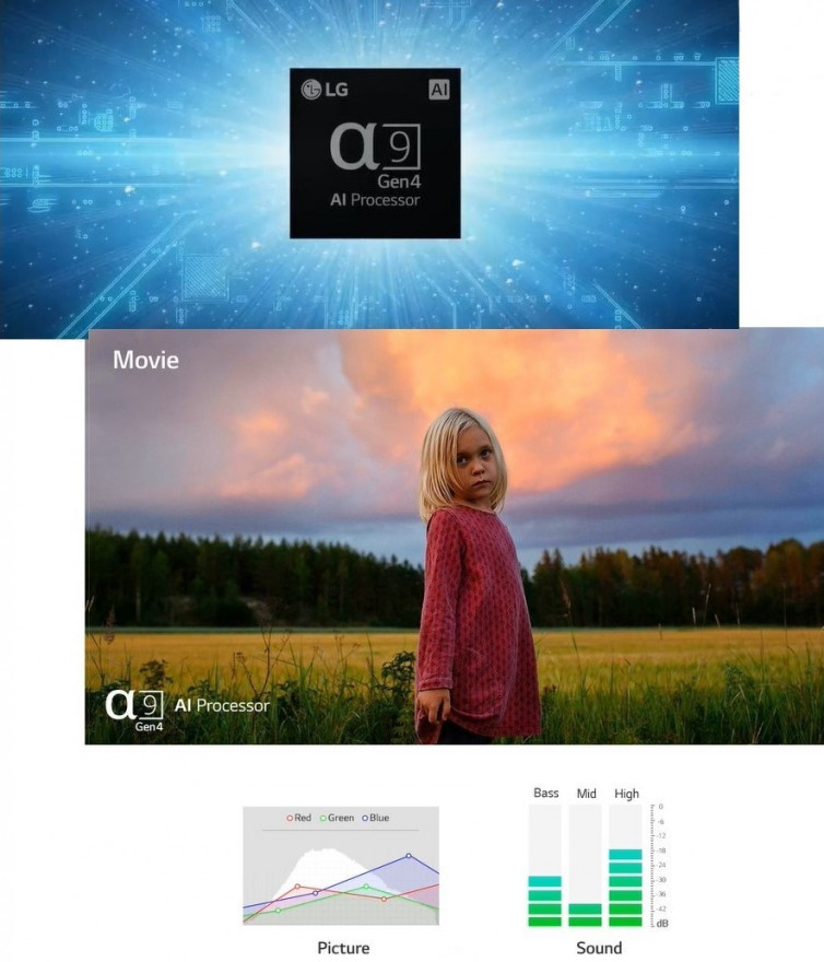Středobodem každého LG OLED TV je procesor α9 Gen4 4K AI, revoluční čip, který k analýze a optimalizaci obsahu využívá algoritmy hlubokého učení. Každá úprava obrazu a zvuku probíhá automaticky, takže všechno, co sledujete, bude vypadat úchvatně.