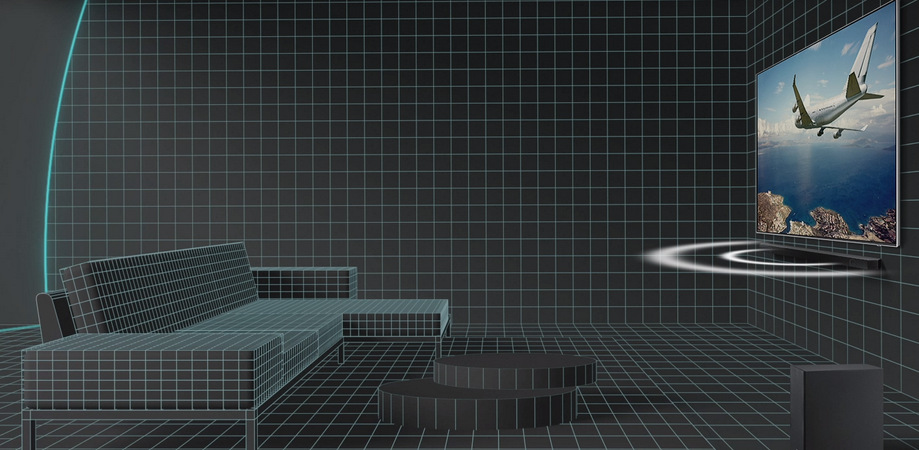 Tento soundbar se synchronizuje s televizorem Samsung a společně vytvářejí pohlcující audio. Kombinuje a vylepšuje zvuk prostřednictvím předních, bočních a nahoru směřujících reproduktorů soundbaru a zároveň reproduktorů televizoru, díky čemuž získáte novou úroveň akustického pohlcení.
