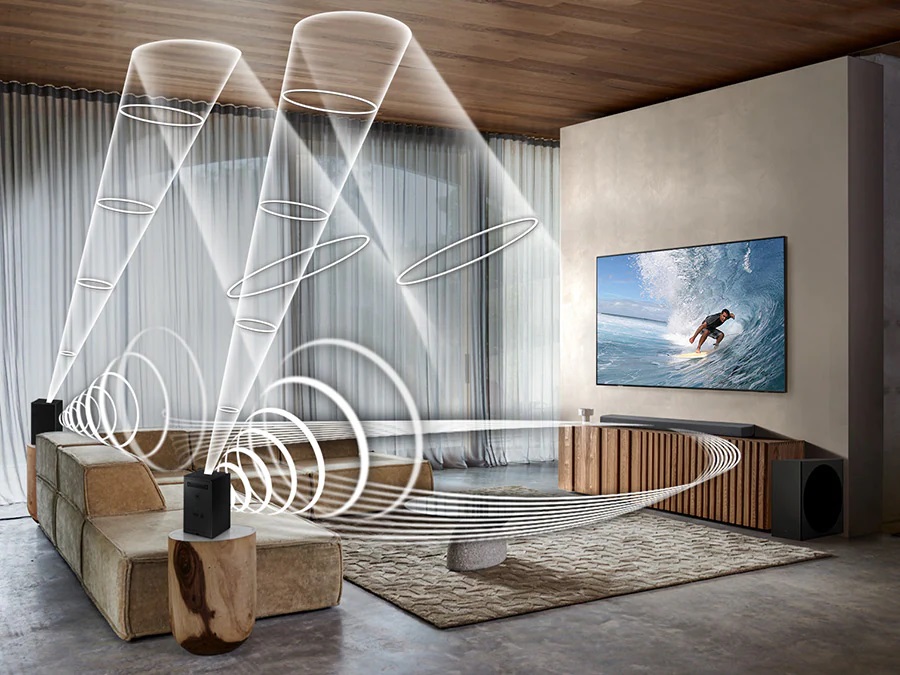 *Bezdrátový přenos přes Wi-Fi Wireless Dolby Atmos funguje s (vybranými) televizory Samsung z roku 2022. *Dolby Atmos a DTS:X platí pro všechny soundbary řady Q z roku 2022. *Vyžaduje se zdrojový obsah Dolby Atmos a DTS:X