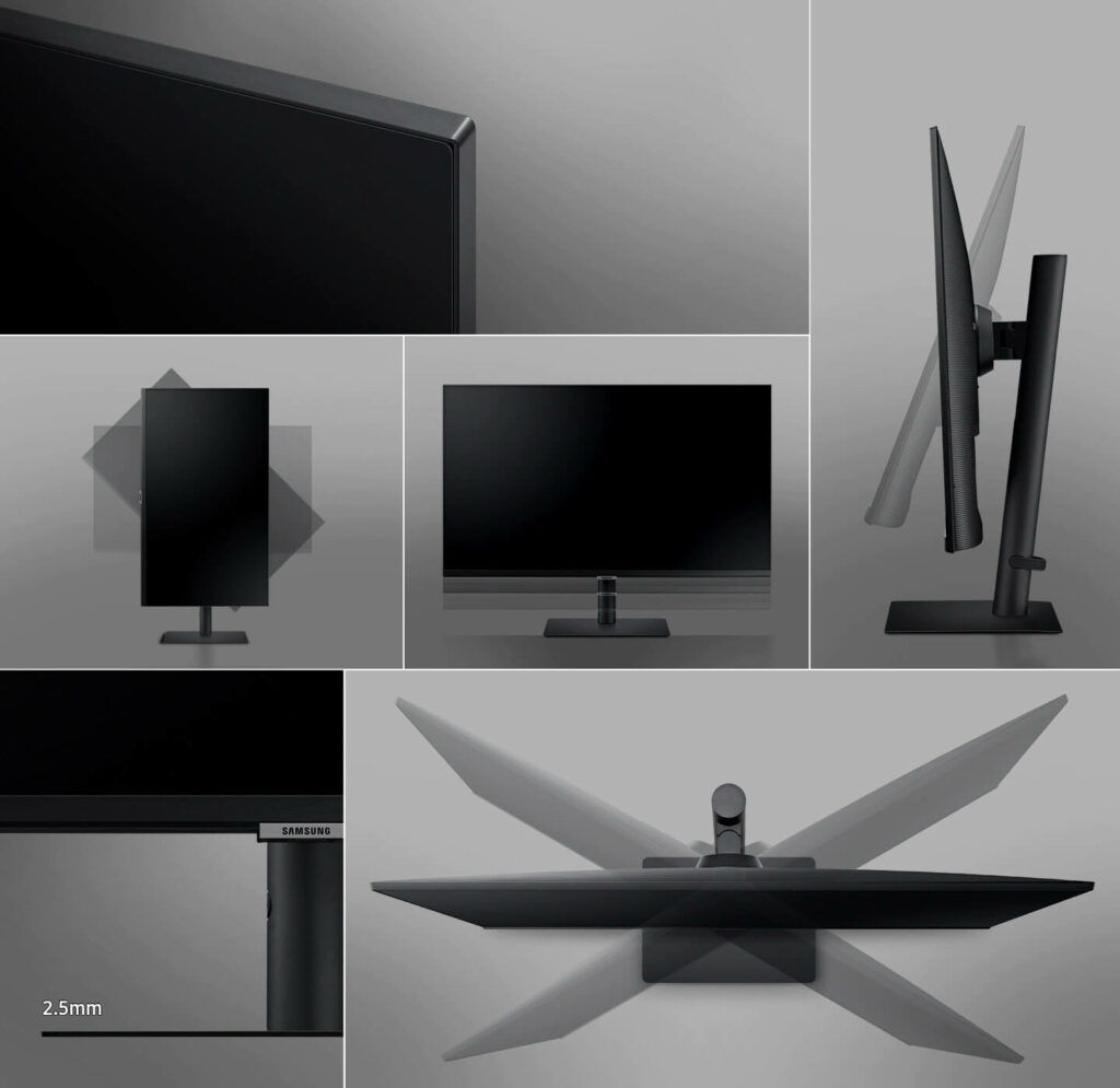 Umístěte monitor tak, abyste dosáhli optimálního pohodlí. Design bez okrajů, kompatibilita se systémem VESA a různé možnosti naklánění, otáčení a překlápění umožňují umístit monitor do libovolného prostředí. Díky tenkému kovovému stojanu a malé hloubce navíc zabírá méně místa na stole a zajišťuje čistý a úhledný prostor pro práci.