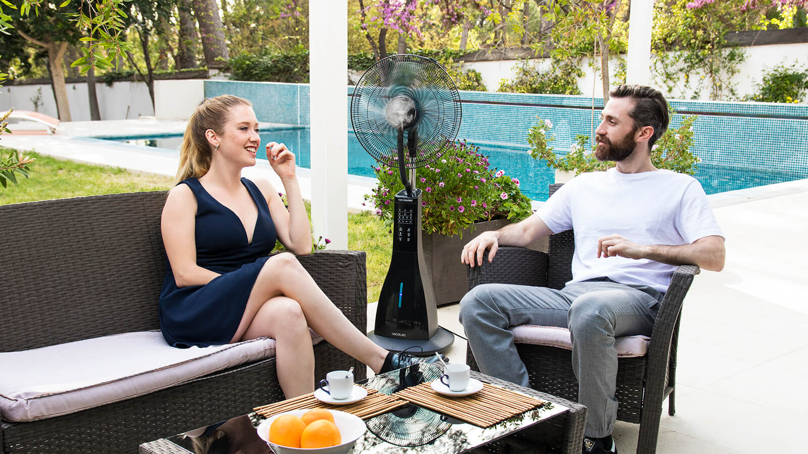 Stojanový rozprašovač s rozprašovanou vodou pro domácnosti nebo terasy. Velmi silný. 3 L. Oscilující. Tichý. 3 rychlosti. 5 lopatek. Časovač. Nastavitelný. Měděný motor. Digitální displej. ForceSilence 690 FreshEssence od Cecotec.