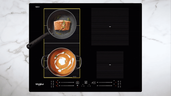 Maximálně využívá dostupný prostor a zajišťuje rovnoměrnou distribuci tepla prostřednictvím 4 indukčních cívek. Varné zóny lze využívat samostatně nebo je vertikálně propojit, abyste mohli kamkoli na plochu postavit jakkoli velký hrnec a poté jej v rámci plochy přemisťovat.