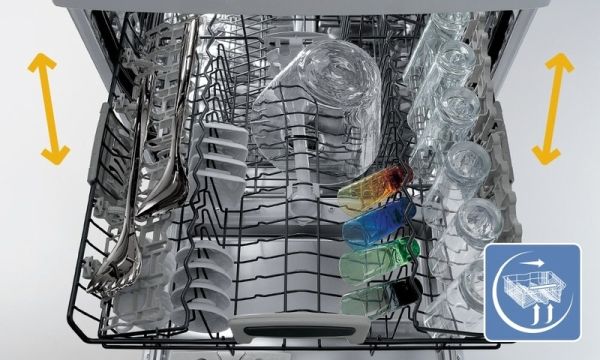 Užijte si více volného času díky myčce. Horní koš je výškově nastavitelný, což vám umožní uložit do spodního koše objemnější kusy nádobí. Jednoduše ho nadzvednete uchopením bočnic koše. Pro vrácení do spodní polohy je třeba stisknout páčky na bocích koše a posunout jej dolů. Koš je potřeba nastavovat pouze, když je prázdný! V horním koši se nachází sklopné držáky, které umožňují optimalizovat uspořádání nádobí. Sklenice na stopce lze bezpečně uchytit do sklápěcích opěrek. Dolní koš je ideální pro ukládání hrnců, talířů, poklic a salátových mís. Je vybaven oporami proti převrácení, které lze použít ve svislé poloze při ukládání talířů nebo v horizontální pro uložení větších kusů nádob. Nachází se v něm i košík na příbory s horní mřížkou pro lepší uložení příborů.